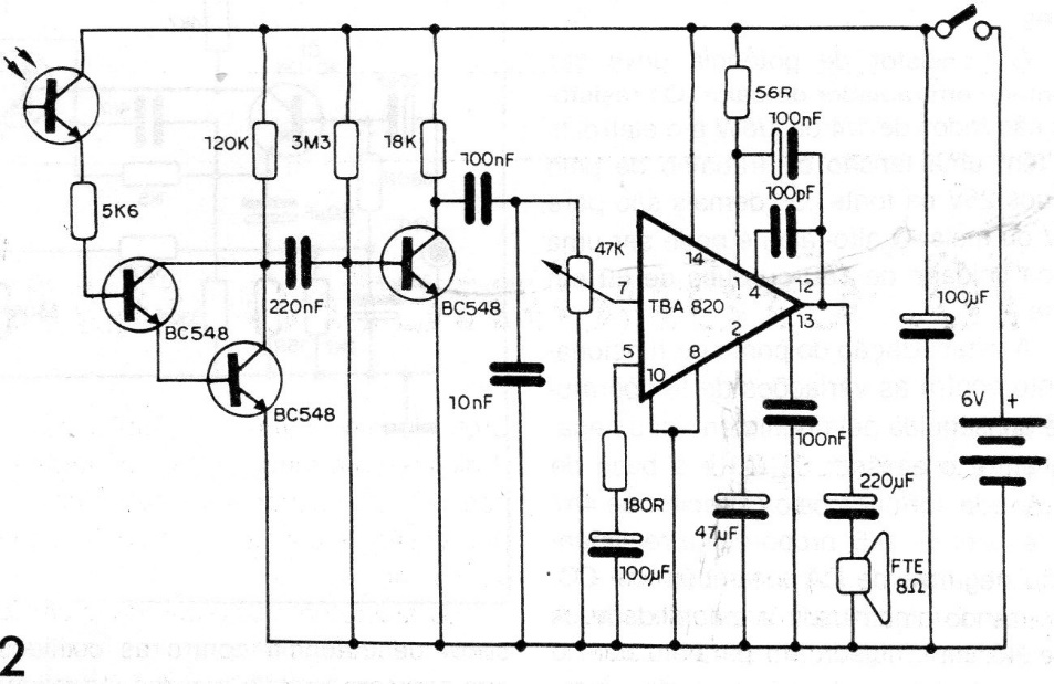 This circuit can receive the signals from CIR10466 or another like this, of the many described on this site. The circuit uses an unusual amplifier today, but it can be modified to operate with a more modern one like the TDA7052. The circuit is powered by 4 batteries, and any phototransistor will do. More sensitivity can be achieved by placing the LED in a tube with a lens.