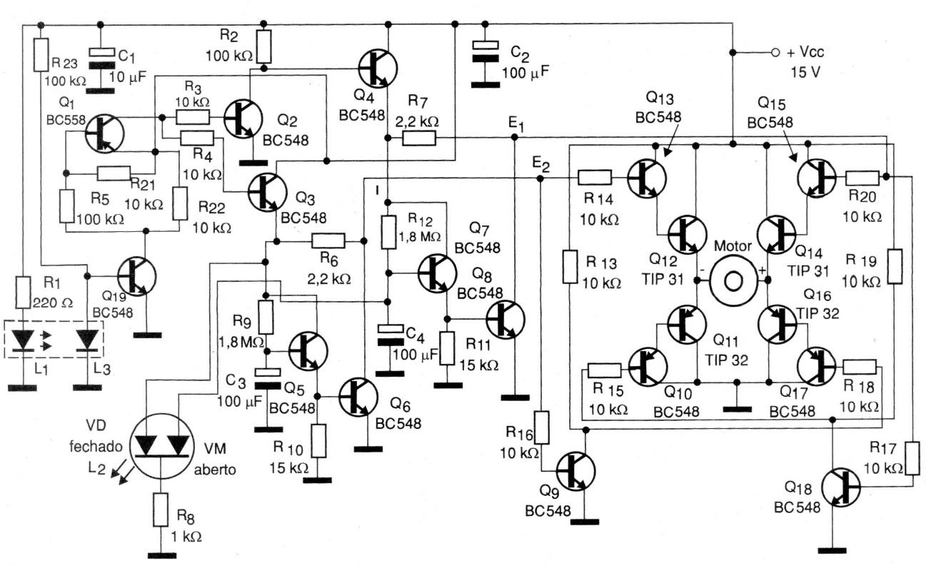 We found this motor control circuit that uses only transistors in a 2003 documentation. The H bridge power transistors must have heat sinks and in the case of TIP31 / 32 the maximum current is in the order of 3 A. The circuit is powered by 12 V voltage and can be adapted to operate as a microcontroller shield.