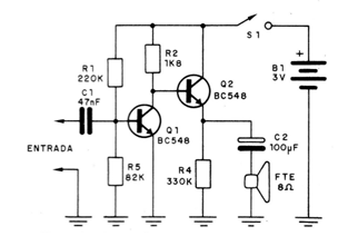 This simple two-transistor signal tracker was found in a 1985 documentation, but its circuit can be easily assembled today. The circuit uses two small batteries in the power supply to follow audio signals.