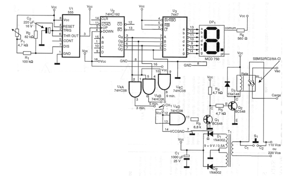 This circuit was found in a 1998 documentation. It consists of a timer with a 1-digit indicator for time intervals up to 99 minutes. The washer is turned off automatically due to the action of the relay. The circuit must be powered with 5 V as it uses TTL integrated circuits.