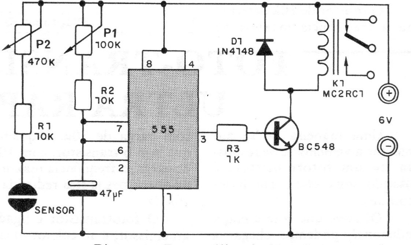 A touch on the sensor causes the relay to trip and remain so, for a time that can be adjusted in P1 and which also depends on the capacitor. This capacitor can have values up to 2,200 uF and P1 can have values up to 1 M for times up to 1 hour. The adjustment of the sensor is made in P1 which can have values up to 2M2. The supply voltage can be 6 or 12 V depending on the relay used. Never use a source without a transformer to power this circuit.