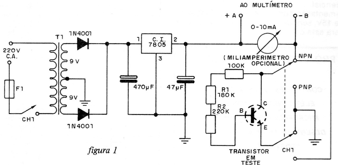 With this simple tester you can measure the gain of an NPN or PNP transistor. The instrument can be a 10mA full-scale milliammeter or the corresponding current scale of an ordinary multimeter. The circuit includes a regulated source, but it can also be powered by batteries.
