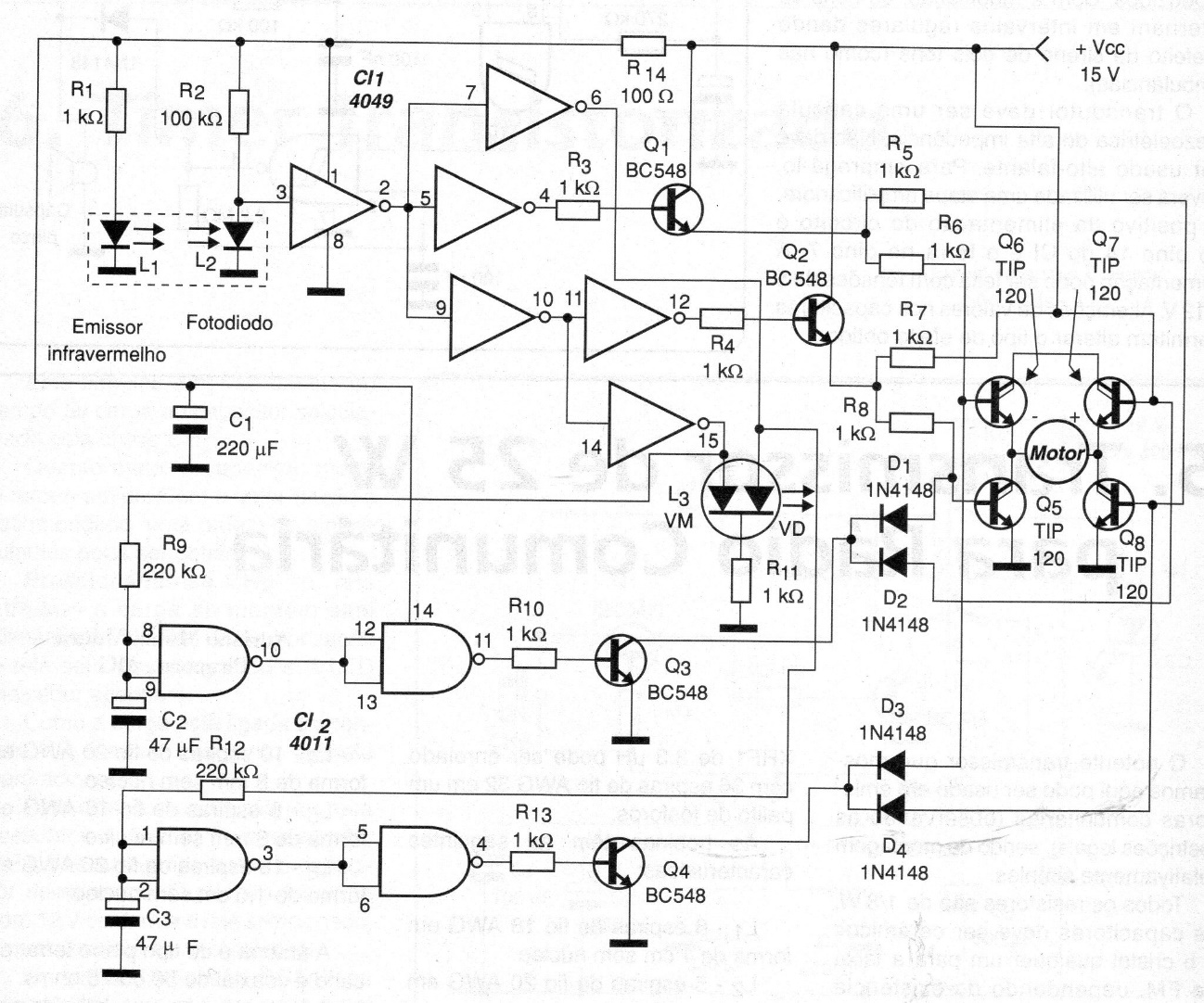 This circuit, which can also be adapted to function as a microcontroller shield, is from 2003 documentation. The maximum current of the controlled motor depends on the transistors, and in this case, it is of the order of 1.5 A. Other Darlington of the TIP series can be used to control larger currents. H bridge transistors must be mounted on heatsinks.