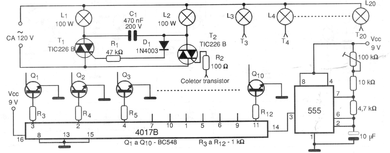This circuit was obtained in a 1999 documentation and makes use of common components. The circuit works only with incandescent lamps and the TRIACs must have good heat sinks. The circuit must have a separate source for the drive (9 V).