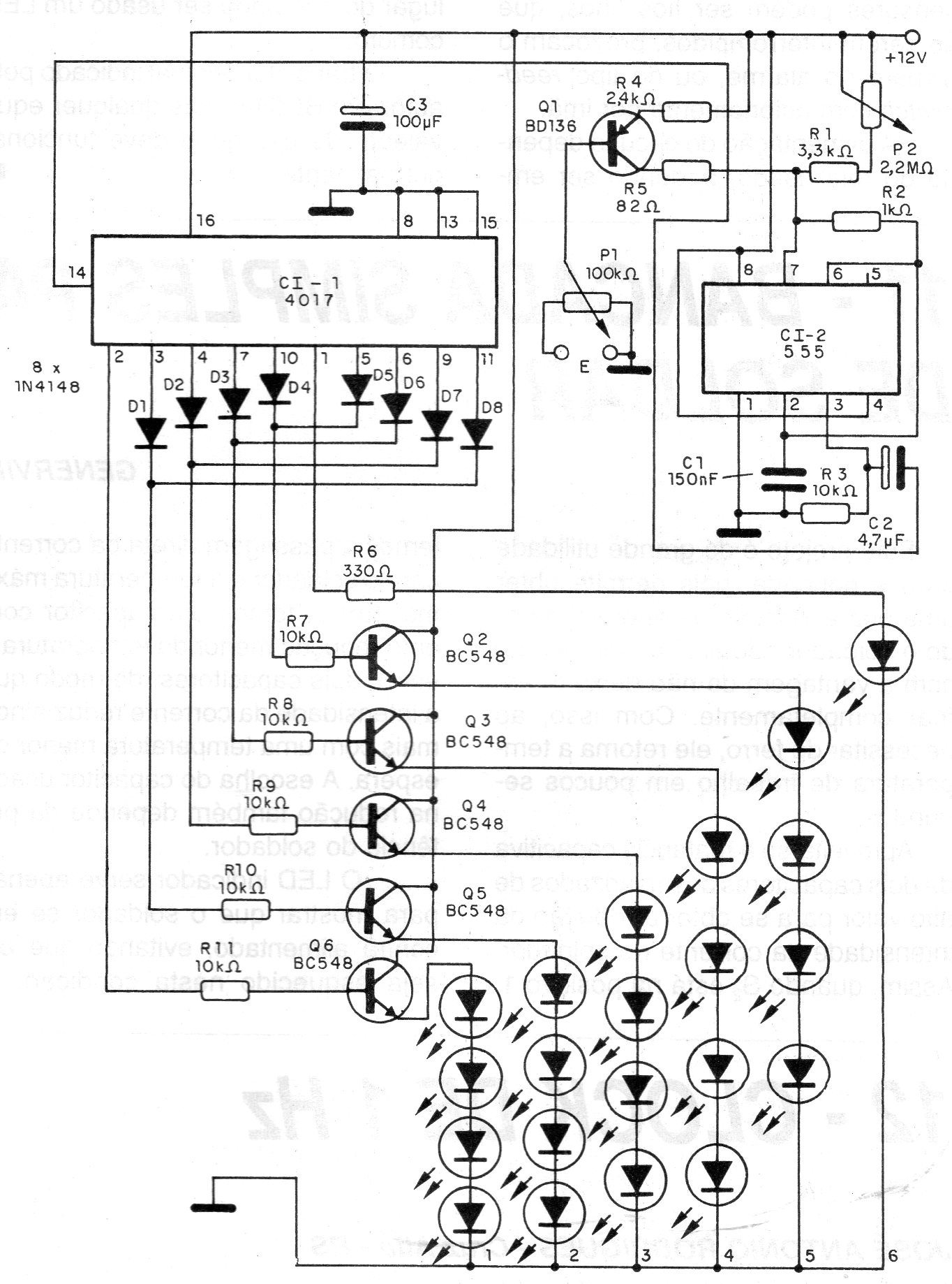 This effects circuit was found in a 1995 documentation. The circuit causes a sequence of LEDs to flash at a speed that varies with the audio signal applied to the input. The circuit is modulated by a 555 via an audio signal. The supply is made with a voltage of 12 V and the adjustments are frequency and depth of modulation.