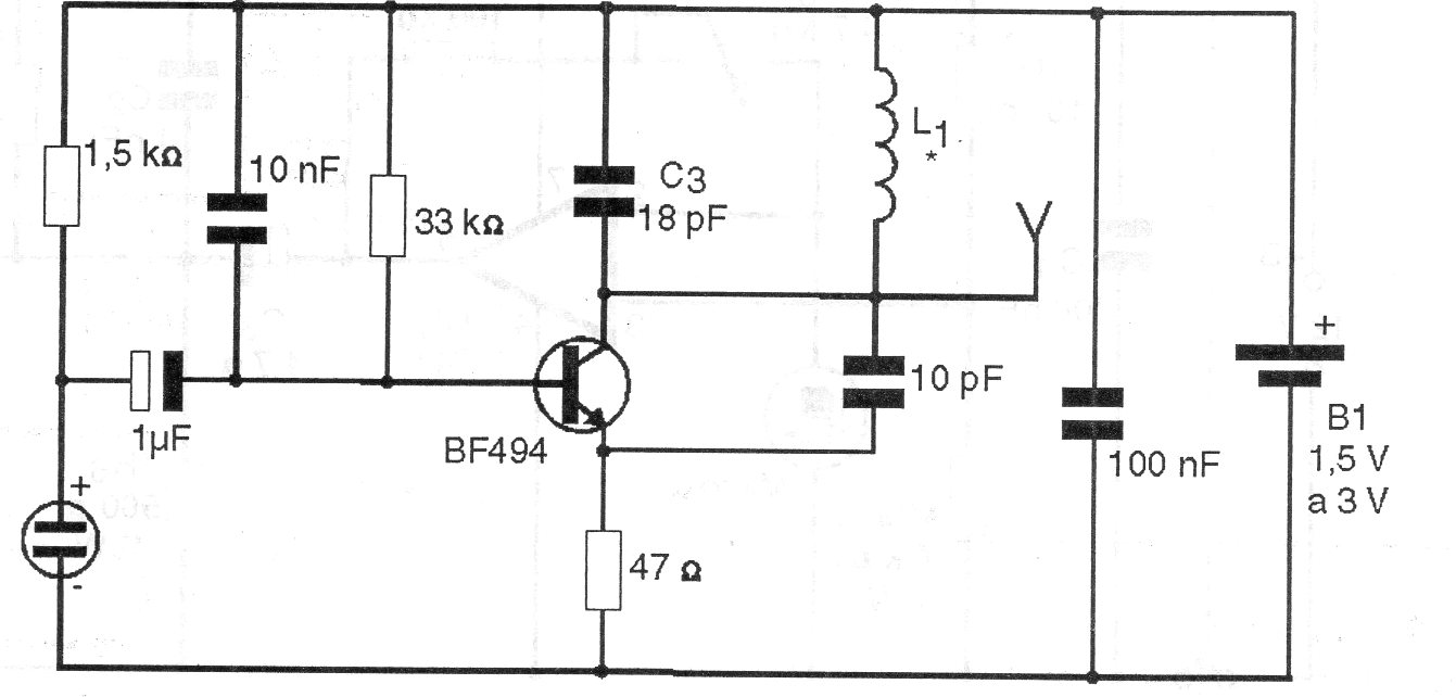 This is a conventional FM micro transmitter circuit already used several times on this site. The frequency adjustment is done by tightening or loosening the coil turns. It consists of 4 turns of AWG 22 or 24 wire air core and 1 cm in diameter.