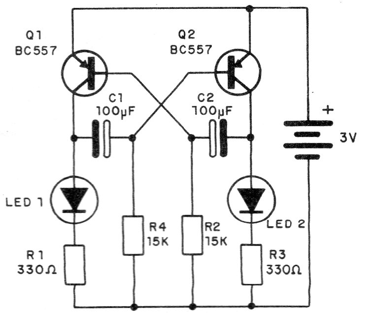 This conventional LED flasher circuit has a configurable multivibrator configuration with PNP transistors. The frequency is given by the capacitors that can be changed. The circuit works with voltages from 3 to 9 V and consumption is low.