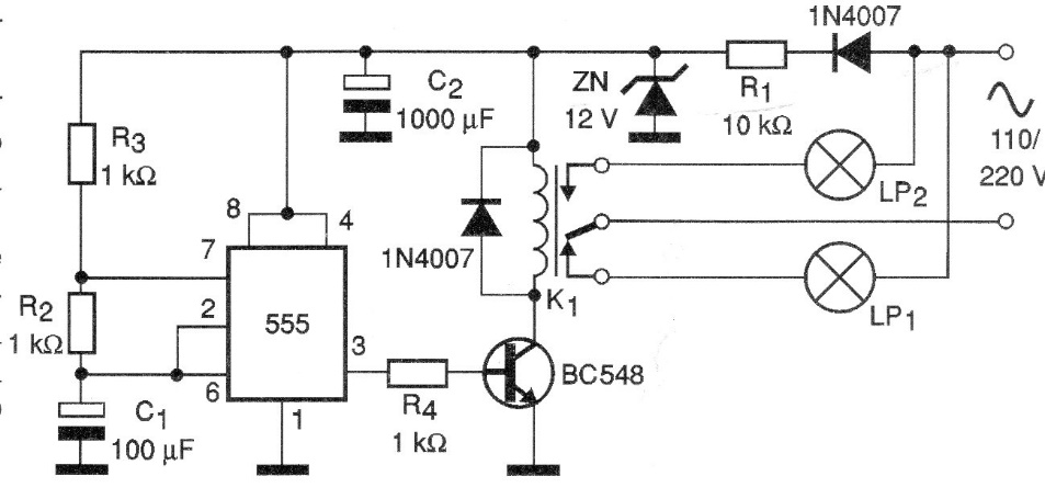 The project presented consists of a flasher alternated with relay, which can be installed at the exit of garages, codomains, or for decoration. The circuit consists of an oscillator mounted around a 555 in the stable configuration. This circuit sends pulses to the base of a transistor that controls a relay. The circuit supply comes directly from the power network through a very simple reducer.