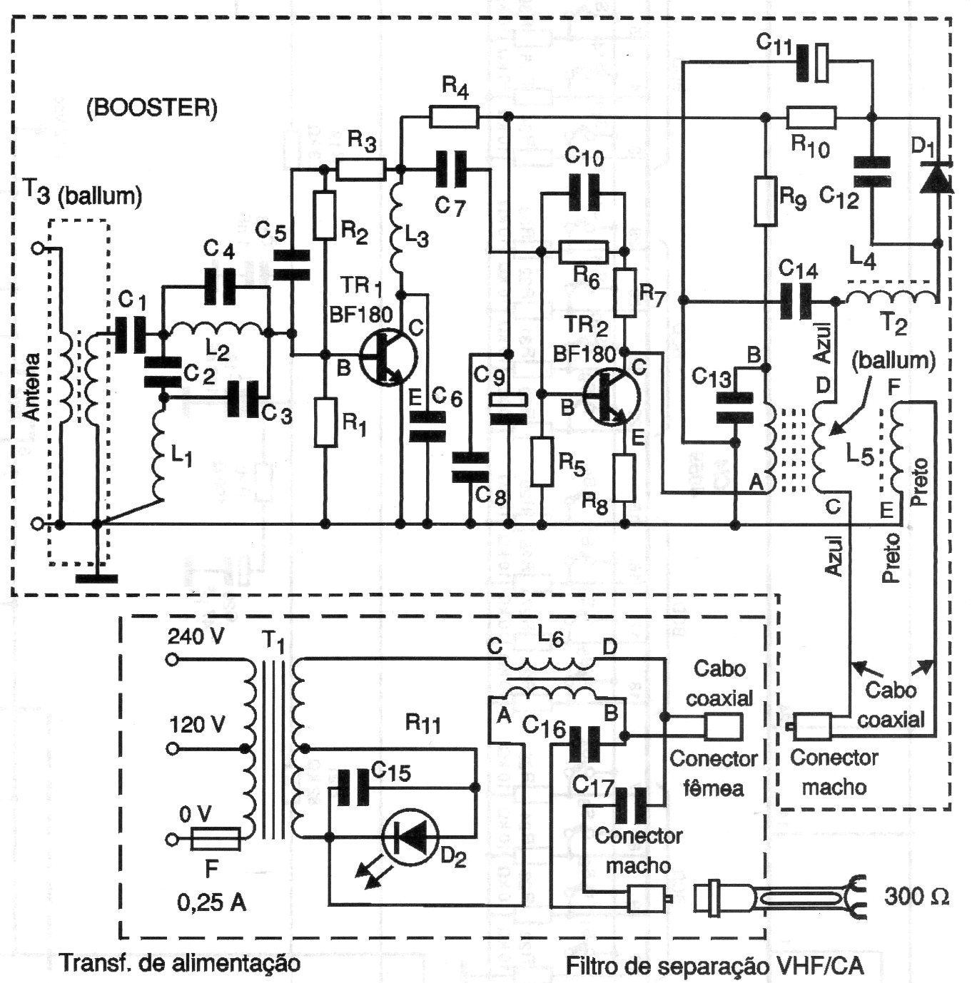 This circuit is from a 2001 publication. The balun transformers are of the commercial type for TV and the coils consist of 10 turns of wire 28 in ferrite rod. The circuit has a source that feeds the circuit through the cable itself, since it must be close to the antenna.