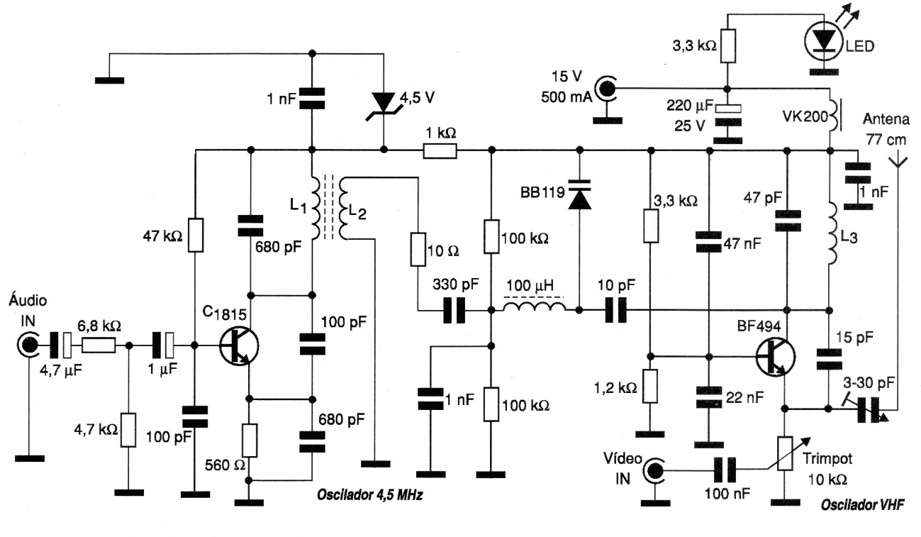 We found this circuit in a 2008 documentation. It transmits composite video and audio signals to an analog receiver operating in the VHF range, channels 2 to 7. The circuit has a range of a few tens of meters and can be used in a monitoring or security with a camera of the type that provides the necessary signal. L1 has 38 turns of wire 30 to 32 in a 3.5 mm diameter FI transformer core. L2 has 8 turns of the same wire over L1. L3 has 4 turns of wire 28 in the form of 0.5 cm with adjustable core.
