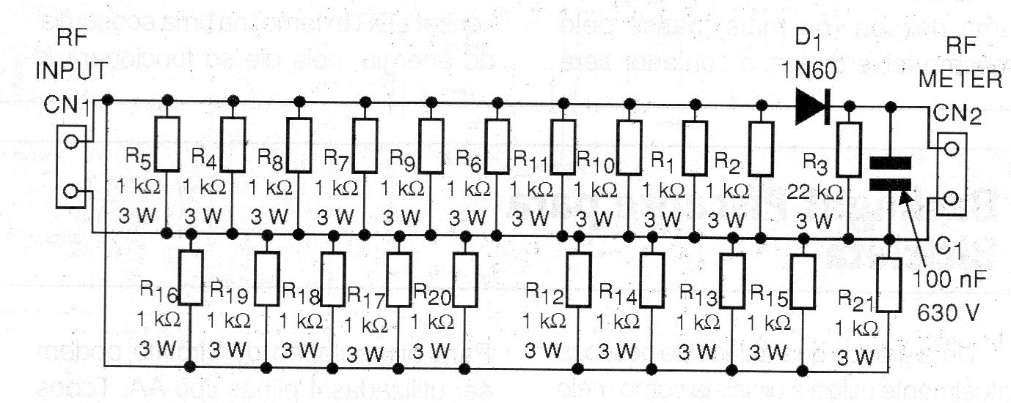 The circuit shown. From a 2009 documentation, it is used to work as a phantom antenna (non-radiating) or artificial charge and an RF meter, for adjusting transmitters. Resistors must be carbon or film. The assembly must be done inside a metallic box (armored) with the use of sand to cool the circuit. The sand used is of the fine white type, which must be washed and taken to the sun or oven to be free from any moisture.