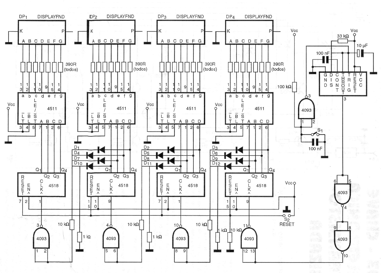 This circuit can be used for several purposes such as pulse counter, pass counter, roulette, etc. The circuit has 4 digits with common cathode displays and must be supplied with voltages from 6 to 12 V. The circuit is from 1998 documentation.
