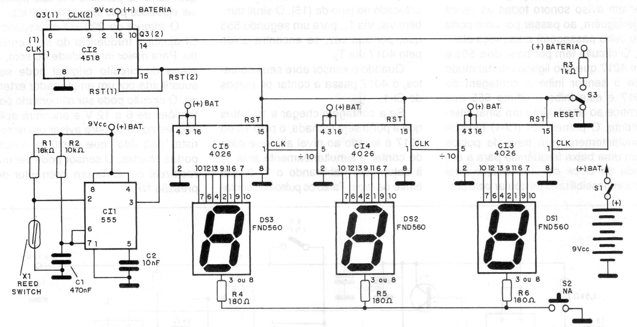 We found this 3-digit digital odometer for bicycles (or another application) in a 1995 documentation. The circuit uses a reed switch as a sensor that is activated by a magnet attached to the wheel rim (or another moving part, for another application). The circuit is CMOS and can be powered by 4 standard batteries. The displays are common cathode types.