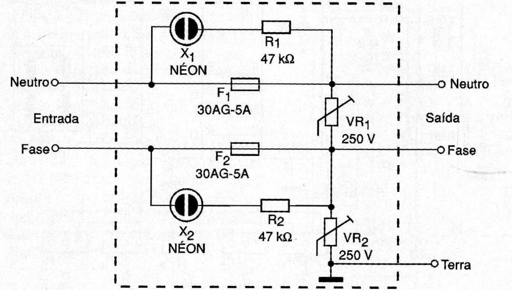 This line protector circuit was found in a 2002 documentation, but it is totally current and serves to protect sensitive equipment, such as computers, against transients coming through the power line. The circuit must be earthed and installed in a metal box.