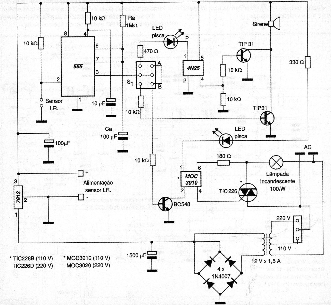 The pass-through alarm we present uses an infrared (IR) emitter as a sensor. When cutting the beam, the sensor sends a negative pulse to the CI 555 input (pin 2), firing it. As a result, the CI output sends a pulse to the 4N25 and MOC 3010 optical couplers. Ra and Ca determine the time the output will be activated. S1 is a type H switch where we have two activation points for the siren: one flashing in position A and another continuous in position B. Another type of warning is the visual formed by the MOC3010 optical coupler that will trigger an incandescent lamp, which will flash at a frequency of 3 times per second.