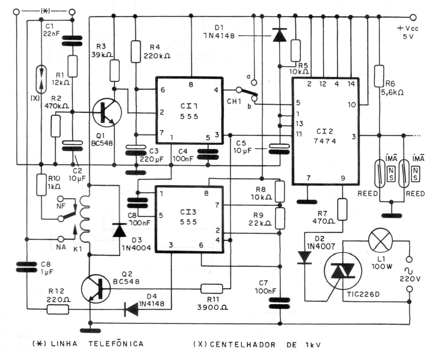 The purpose of this circuit found in a 1995 magazine is to monitor an alarm via telephone. When we call a phone that it is on and the alarm is triggered, a tone will be sent, and the lamp controlled by the triac will be powered. The circuit already includes the alarm sensor system.