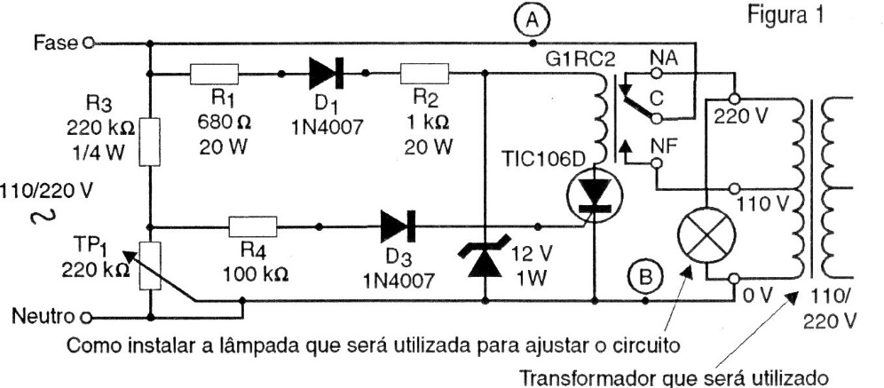 This circuit automatically switches the mains voltage to a transformer. The circuit is from 1997 and the components used are still common in our market. The SCR does not need a heatsink and the trip adjustment, as the voltage is made in P1.