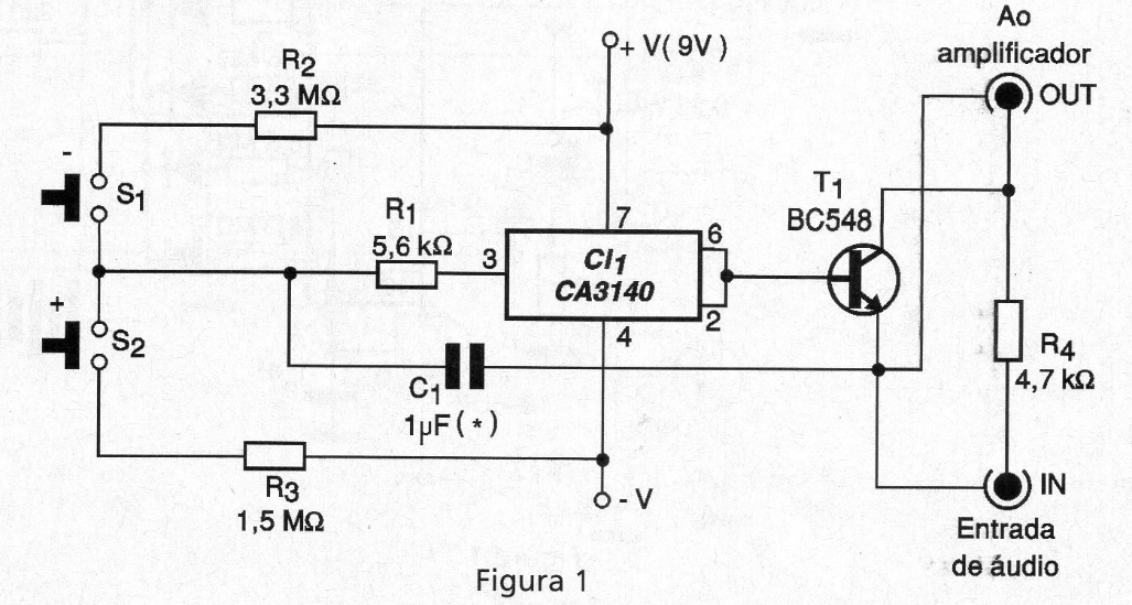 This circuit is from 2002 documentation, requiring a symmetrical source of 6 to 12 V. The signal input and output cables must be shielded. A source without a transformer should not be used, given the danger of shocks.