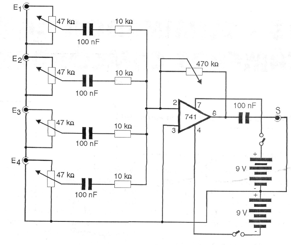 This circuit is a traditional mixer version with the operational 741 and appears several times on this site. The circuit must be powered by a symmetrical source of 6 to 12 V and the signal input and output cables must be shielded.