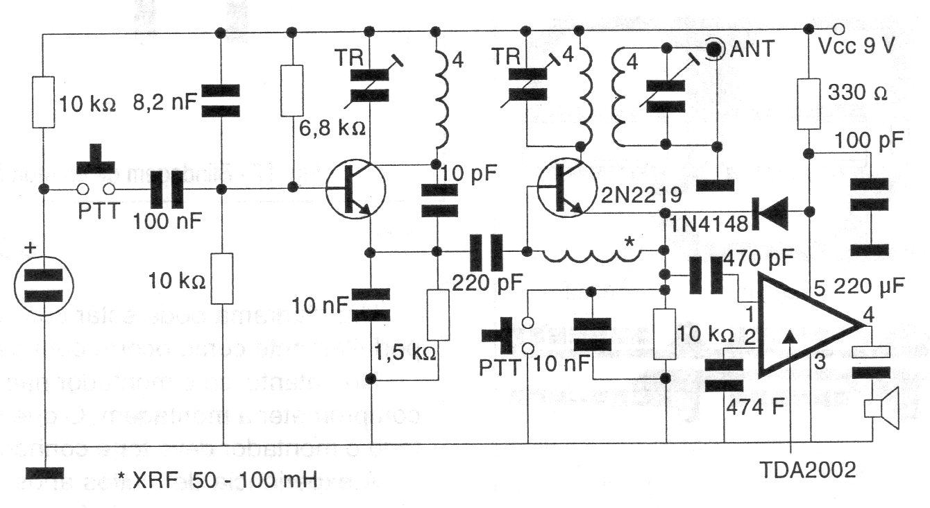 This circuit is from 1998 documentation. The coils consist of the number of turns indicated on each one with 24 or 26 wires in the form of 1 cm. The capacitors must be ceramic, and the shock consists of 50 turns of fine wire (32) in a 100k x ½ W resistor. The circuit is powered by medium batteries since the TDA2002 has a high consumption.