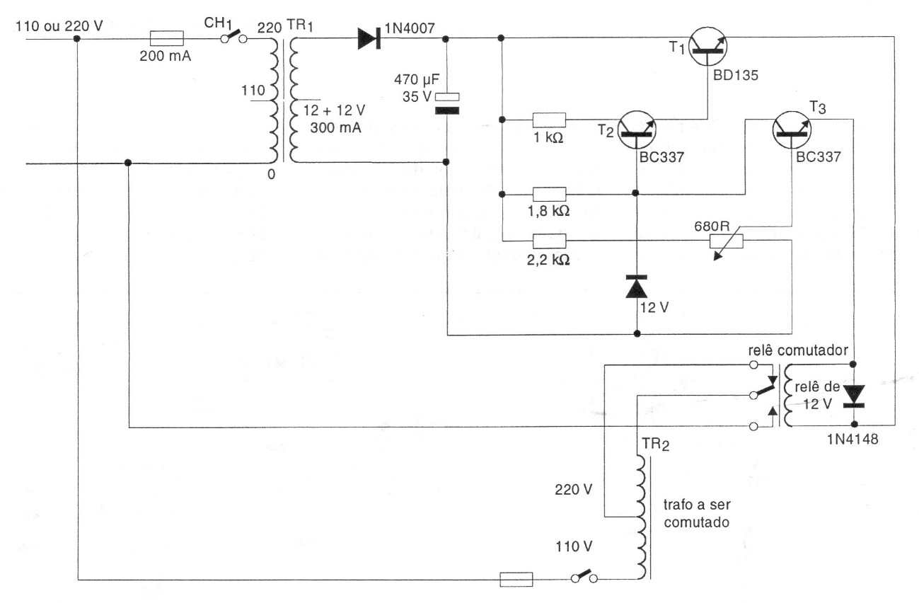 This circuit automatically switches a two-voltage transformer when it detects whether the network is 110 V or 220 V. The trimpot adjusts the trigger point. The relay is 12 V with an operating current of 50 to 100 mA.