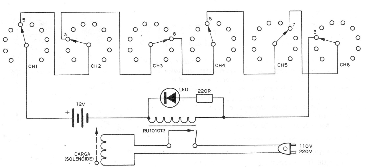 This 1977 circuit only allows the solenoid to energize if the right combination of switch positions is selected. The relay is 6 or 12 V depending on the low voltage supply used.