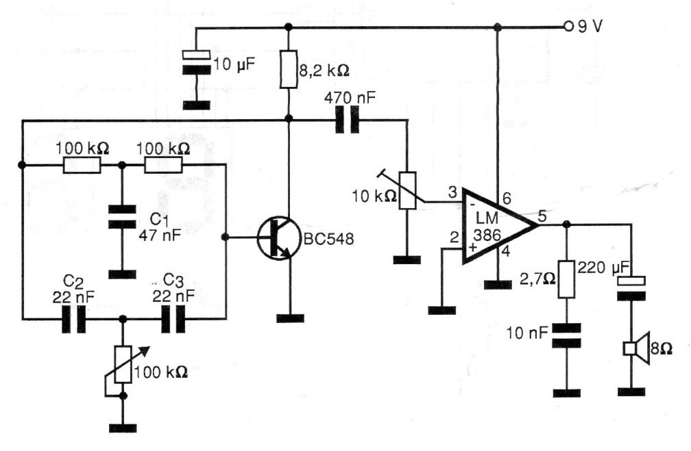 This effect circuit already includes the amplifier that can be replaced by more modern types. The circuit is from 1999 documentation. The adjustment is made in the trimpot and with the replacement of the double T capacitors, other effects can be obtained. The relationship between the capacitor values must be maintained in the event of a change.