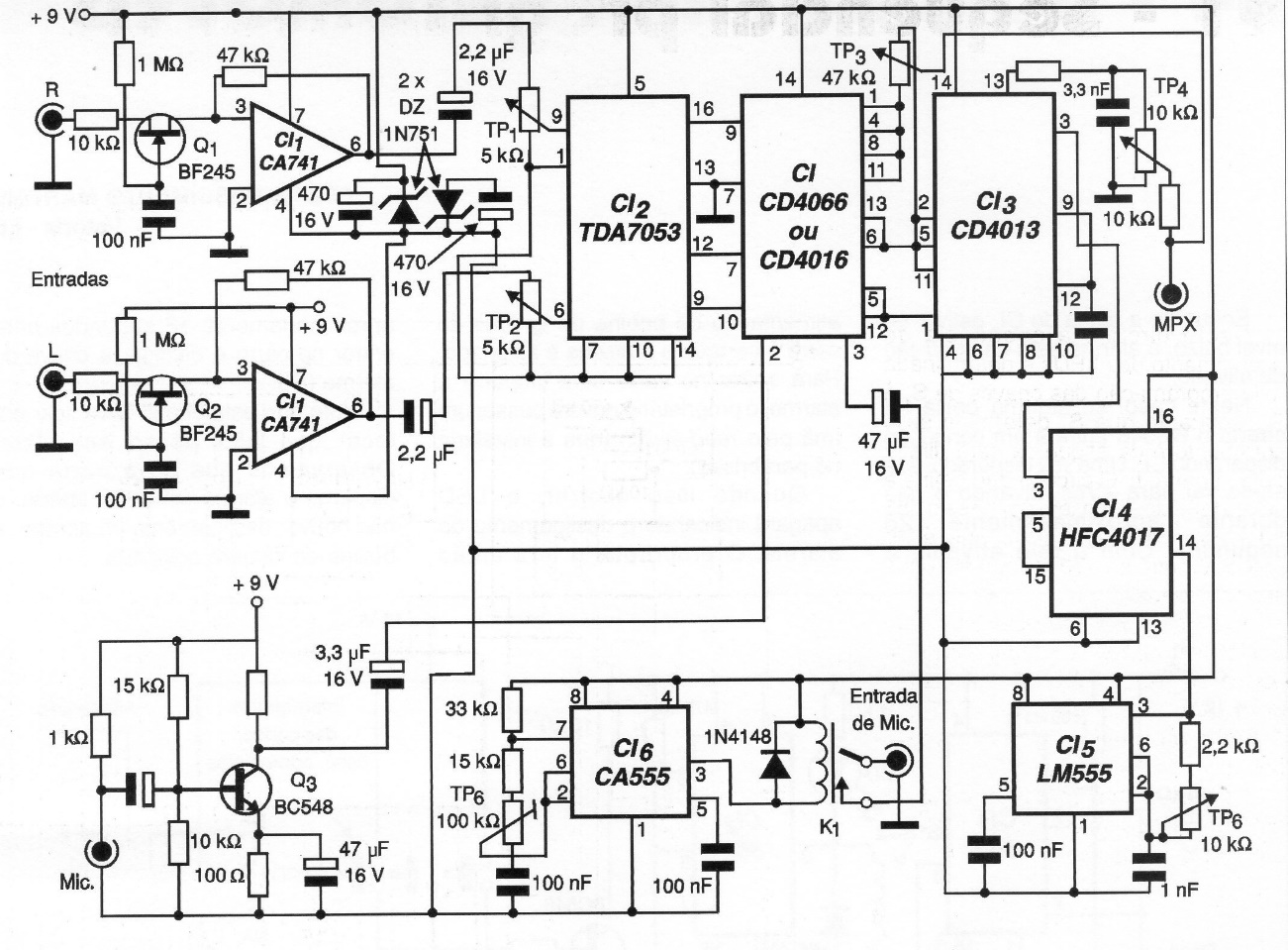This circuit is from 2001 documentation, serving to multiplex stereo signals for FM transmitters. The circuit must be adjusted to obtain the frequency of the pilot signal and in addition, so that there is correct excitation of the channels. The power is supplied with a stabilized 9 V voltage. Signal connections must be short and shielded.