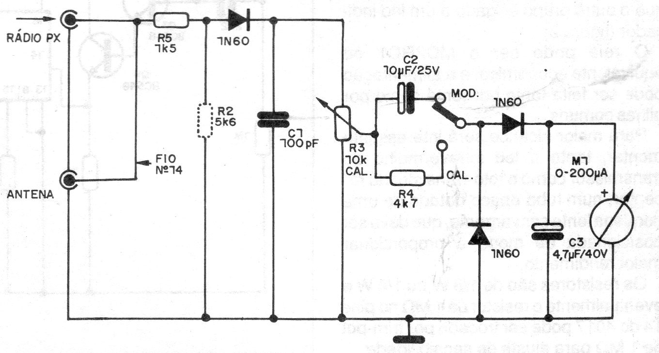 This circuit measures the modulation of a 11-meter transmitter, having been found in a 1989 documentation. The circuit is powered by the signal itself, requiring no source. The indicator is a 200 uA microammeter of the type found as VU in old amplifiers.