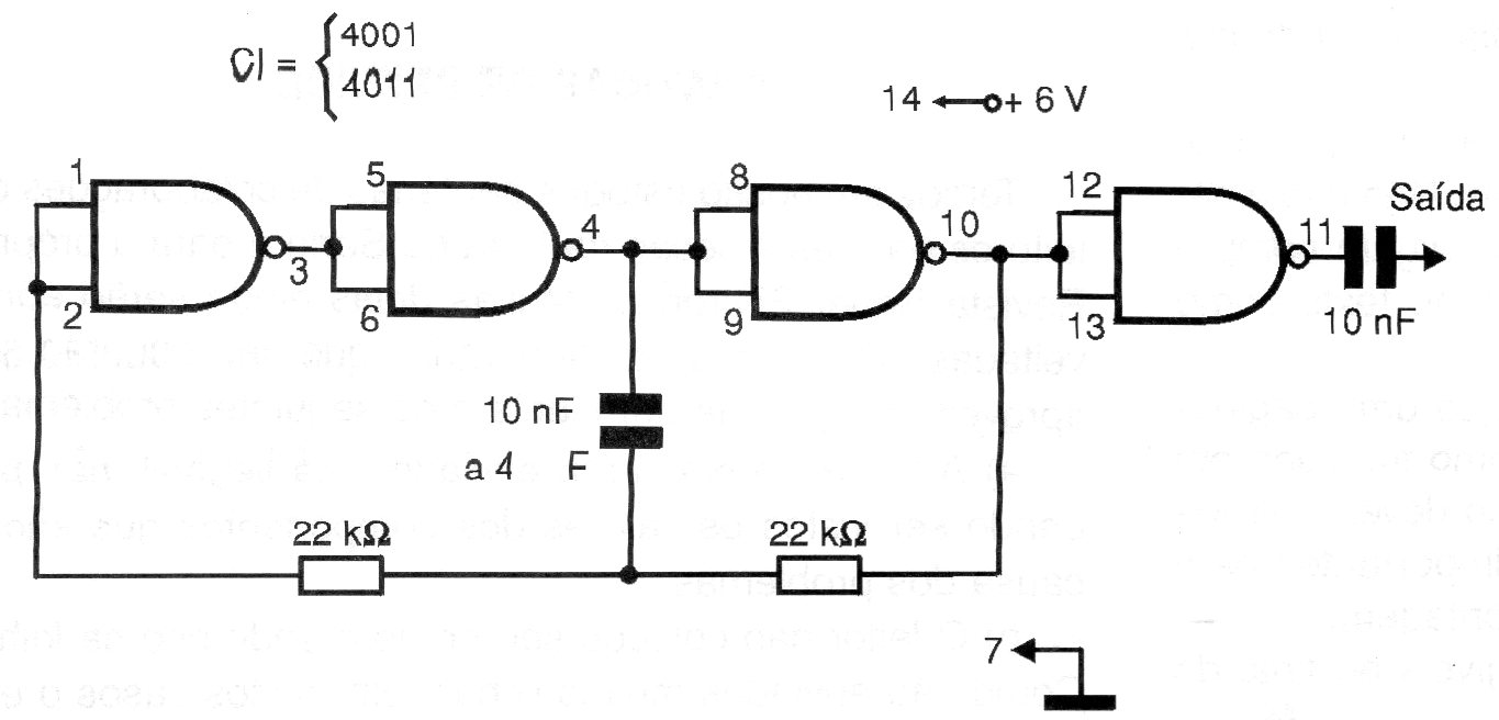 This circuit, which appears at other points on this site, can be designed with both 4011 and 4001 and fed with voltages from 3 to 12 V. The frequency depends on the capacitor that can be changed over a wide range of values. The signal produced is rectangular rich in harmonics.