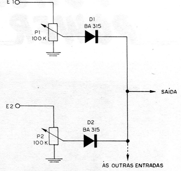 This passive mixer has a configuration that does not always lead to good results from the use of the diodes. Obtained in a 1982 documentation, it has yet another experimental configuration that must be verified by those interested. It is better to replace the diodes with 47k or 100k ohms resistors.