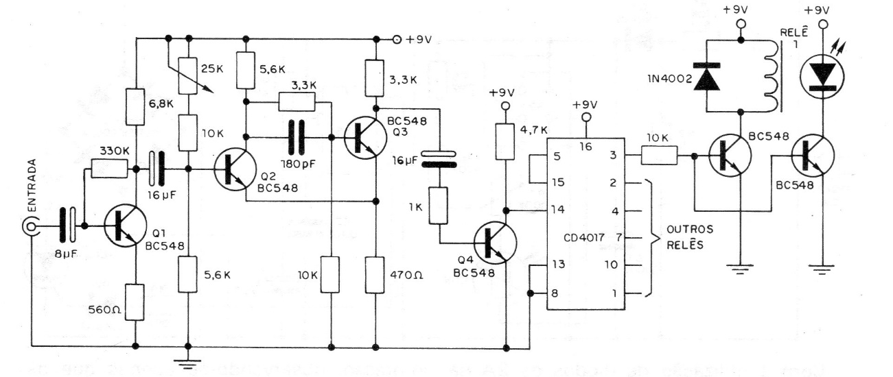 We found this circuit in a 1982 publication, but all the components used are still common in our market. Relays must be 6 or 12 V depending on the power supply, since the 9 V types indicated are no longer common.