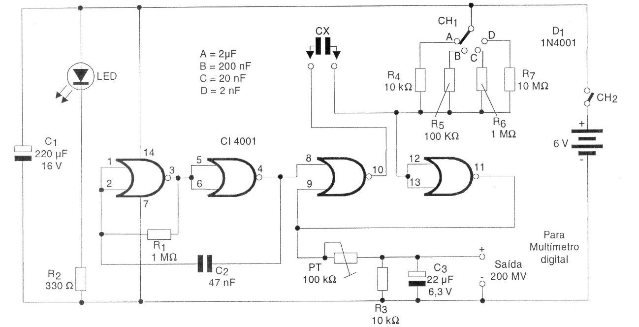 This circuit, found in a 1998 documentation, allows you to use your digital multimeter as a capacitor meter. The accuracy depends on the resistors of the 4 scales and the PT adjustment that must be made with capacitors of known values. The circuit is powered by 4 small batteries since its consumption is very low.