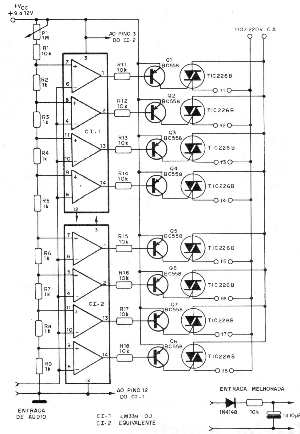 This circuit triggers three incandescent light bulbs following the audio signal applied to its input. The triacs must be equipped with heat sinks and the circuit does not work with other types of lamps. The adjustment of the actuation is done in the potentiometer. Note that the circuit is not insulated for the input signal.