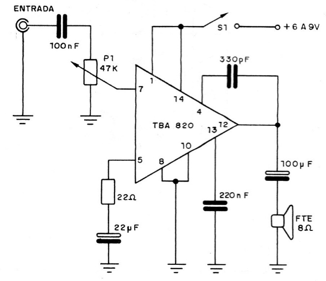 This small signal-following amplifier uses an integrated one that is not very common nowadays. Powered by voltages of 6 to 9 V it provides a few hundred milliwatts which can be useful in the elaboration of a test amplifier or signal follower. A diode can be added at the input to track RF signals.