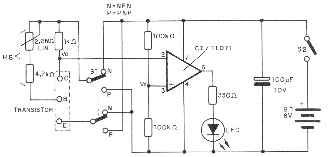 This circuit was found in a 1995 documentation and is very simple to assemble, as the components are common. It tests NPN and PNP transistors and the gain is measured by the LED transition, according to its value given in the table.
