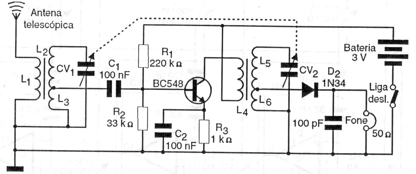 This good receiver contains 6 coils wrapped in ferrite rods. L1 has 20 turns of wire 28 and L2 / L3 has 80 + 20 turns of wire 28 in the same core with socket on the twentieth turns. L4 has 20 turns of wire 20 and L5 / L6 80 + 10 turns of the same wire. The circuit is listened to on a crystal phone or high impedance with excellent sensitivity. The variable is a MW double type.