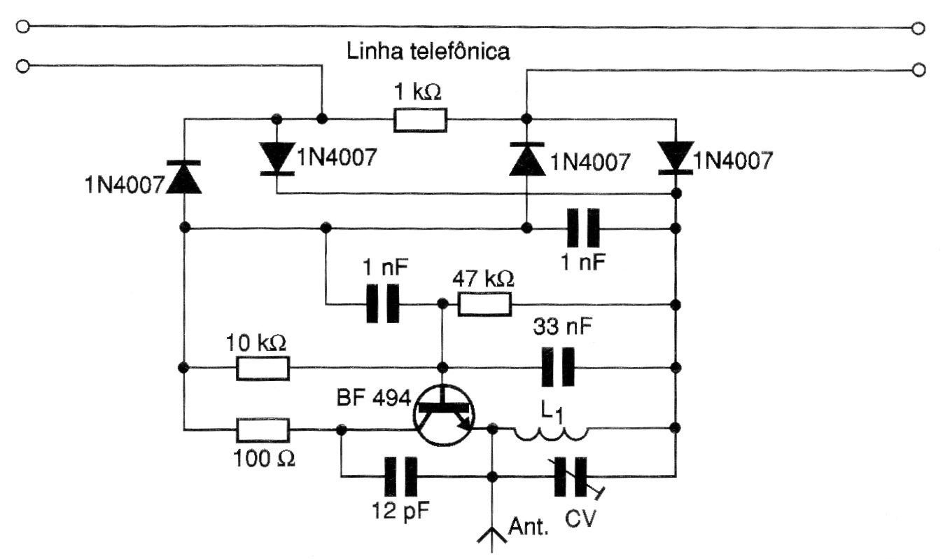 This circuit transmits the audio signals from a telephone line to an FM receiver placed nearby. The coil has 4 turns of wire 28 in the form of 1 cm without core. The trimmer is 2-20pF or greater.