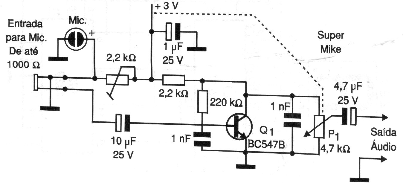 This 2001 circuit is used with transceivers to increase the gain of a microphone and thus obtain better modulation and greater range. The circuit is powered by two batteries and uses a standard electret microphone. The adjustments are for the polarization of the microphone and the strength of the output signal.