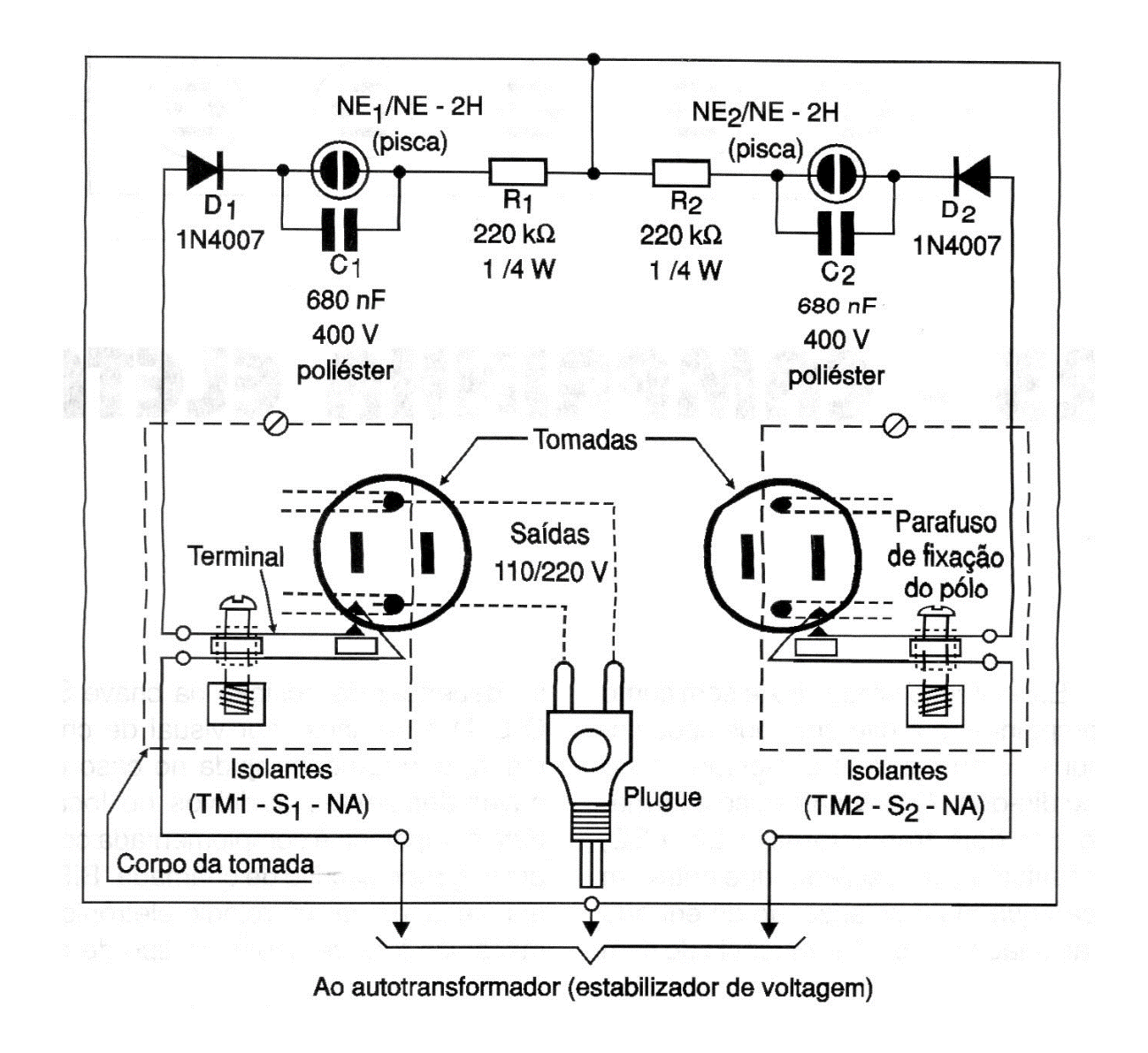 We found this circuit in a 2002 documentation. It still uses old type plugs, but it can be adapted to the current standard. Its purpose is to signal when a device is connected, and it is on. The neon lamp is the common type of any type.