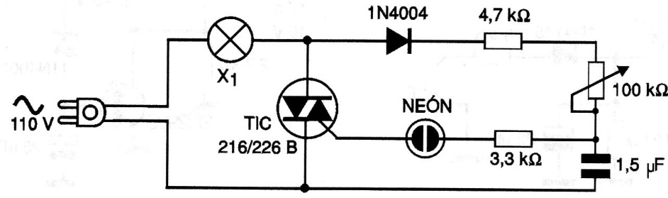 This circuit, discussed elsewhere on this site, is only for incandescent lamps. The frequency adjustment is made in the potentiometer and the capacitor must be made of polyester with insulation voltages of at least 200 V. For the 220 V network use the TIC226D a capacitor for 400 V.