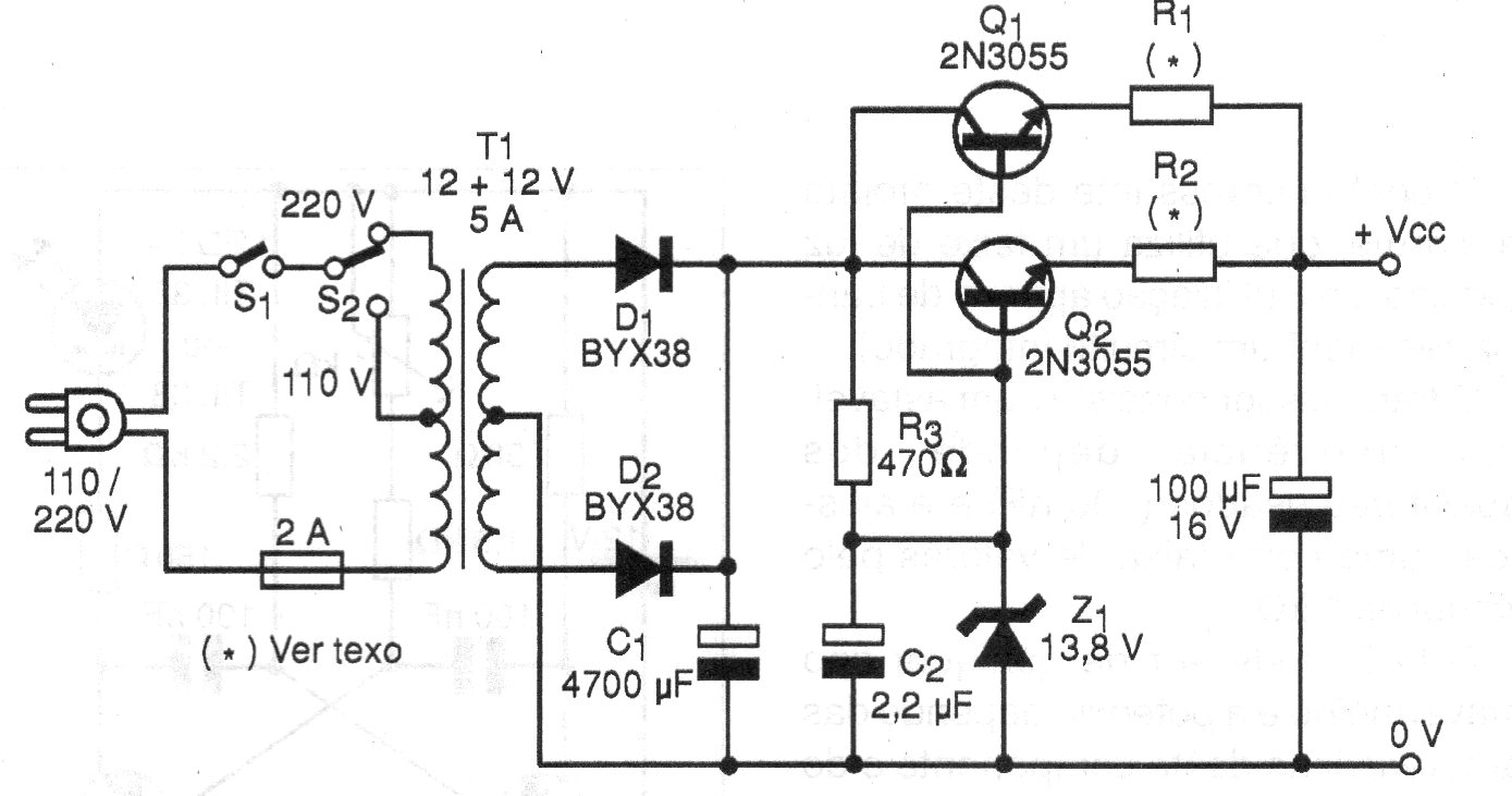 This simple source uses two 2N3055 transistors that must be equipped with good heat sinks. The source has no protection, only an input fuse. The diodes are for 5 A x 50 V or more.