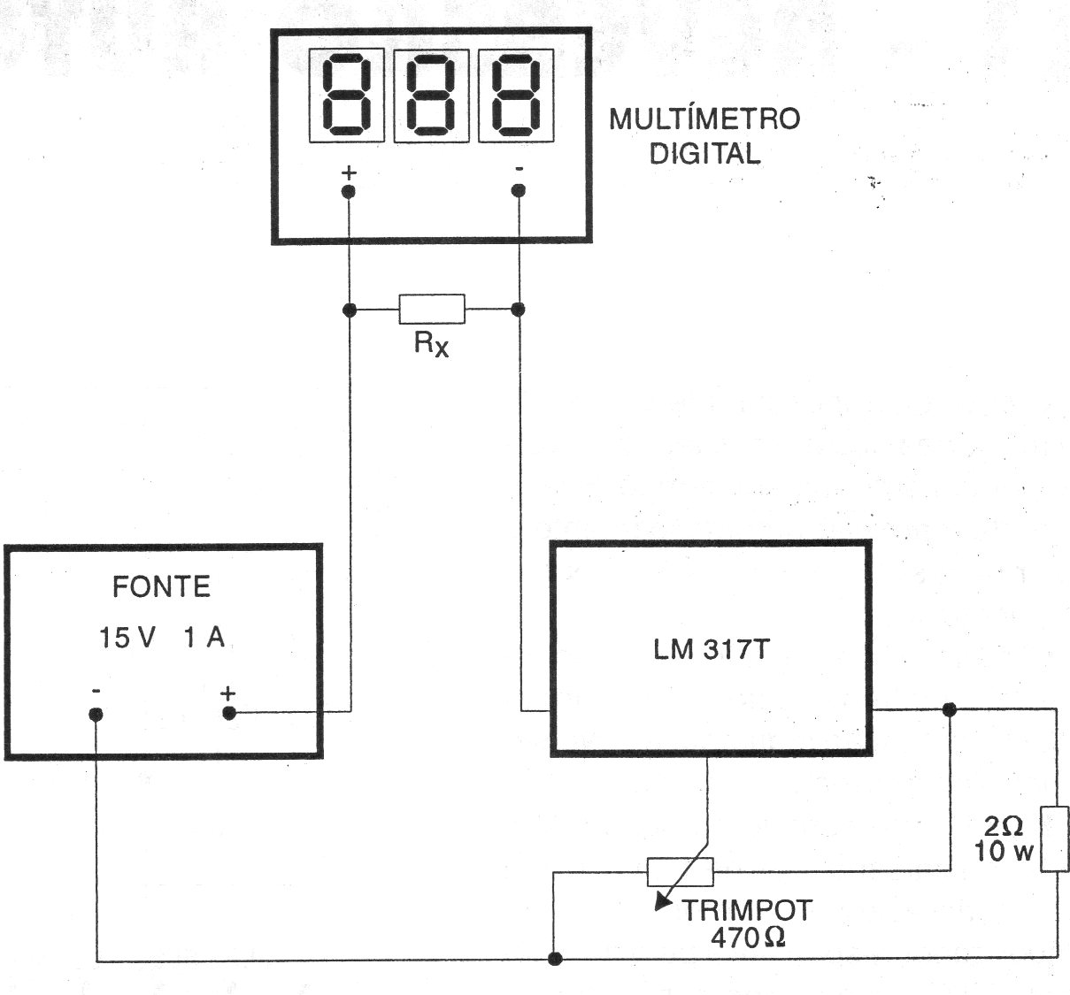 This circuit, with the help of a 15 V x 1 A source, allows to measure small resistances, consisting of a constant current source. The trimpot is adjusted to obtain a current of 1 A so that, if the measured resistor has a measured voltage drop of 1 mV, we can say that it has 1 milliohm. The integrated regulator must be equipped with a heat sink.