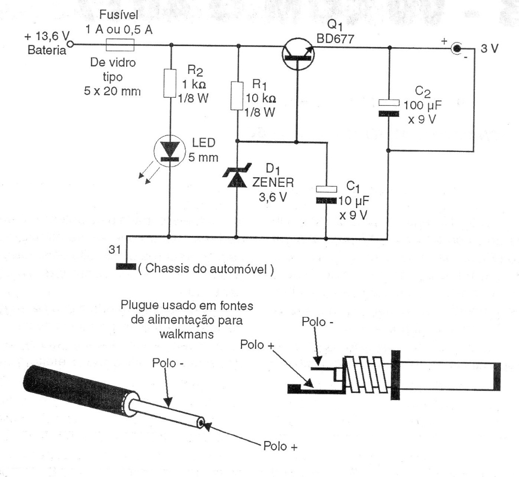 This unit is intended to power 2 AA or AAA battery powered applications from the car battery, using the existing 13.6 V outlet. The maximum current is in the order of 500 mA and the transistor must be mounted on a small heat sink. The zener determines the output voltage.