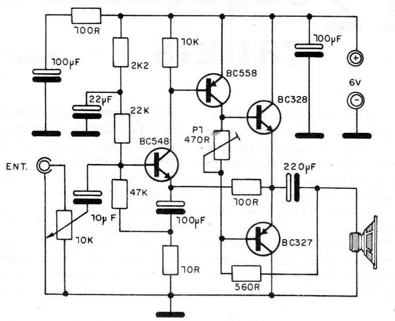 This amplifier uses common transistors and provides a power of 2 watts in a speaker of 4 to 8 ohms. The circuit is powered by 6 V, and the source can be formed by medium or large batteries. The P1 trimpot must be adjusted to a rest current of 40 mA.