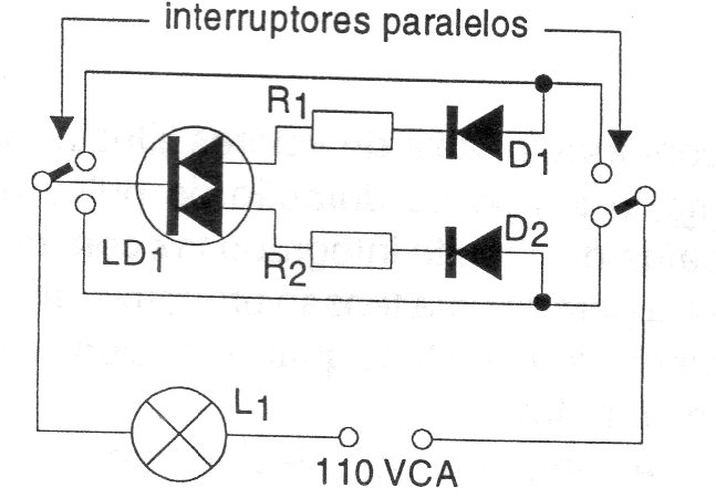 This circuit monitors the activation of a lamp or other load through parallel or two-way switches. The circuit also works at 220 V. For 110 V the resistors are 47k x ½ W and for 220 V 100k x ½ W. Common bicolor LEDs can be used.