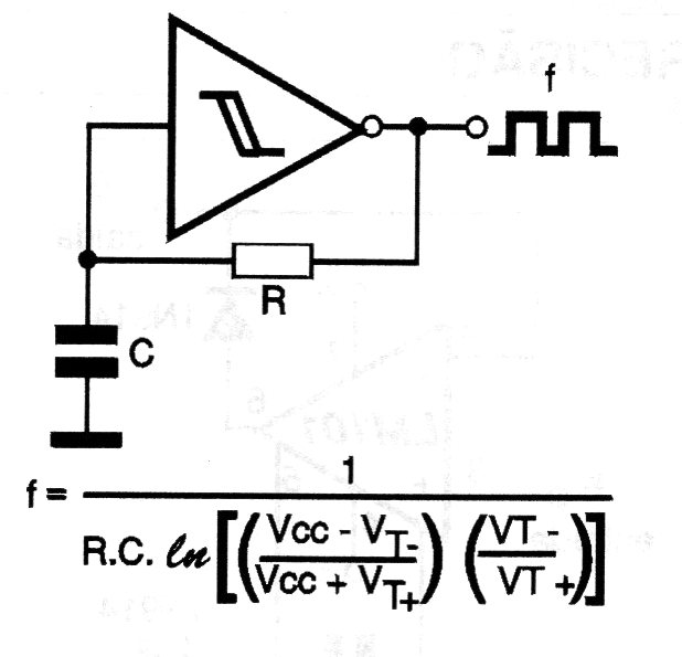 This circuit generates a signal whose frequency can be calculated using the formula next to the diagram. The maximum frequency depends on the logic used and the supply must be made by a voltage of 5 V. The output signal is rectangular.
