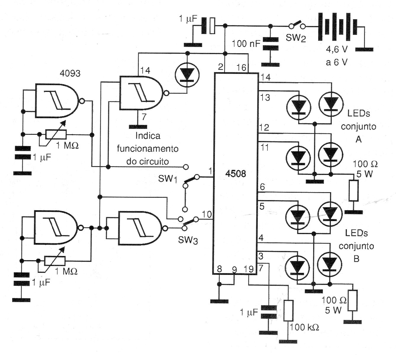 With the presented circuit, random patterns are generated for the flashing of 8 LEDs, leading to a hypnotic or even decorative effect. The integrated circuit used, 4508, consists of a double counter dividing by 9 that works independently. Two oscillators designed around the well-known 4093 integrated circuits are used to activate them. Switches SW1 and SW2 control the mode of activation of the LEDs. The supply can be made by batteries or source with voltages between 4.5 V and 6 V. The use of ordinary batteries is recommended since the consumption of the device is very low. The trimpots next to the oscillators control the frequency of the effect. An idea for a hypnosis effect (not recommended by specialists, without consulting a doctor) is to mount the LEDs on a glass as shown in the same figure in the diagram. (2008)