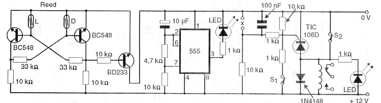 This alarm circuit was found in a 1997 publication. It uses two reed-switches to arm and disarm the system that has a functioning indicator LED. The circuit is based on an SCR that is triggered when S1 (a set of sensors) is interrupted. The supply voltage can be 6 or 12 V depending on the relay.