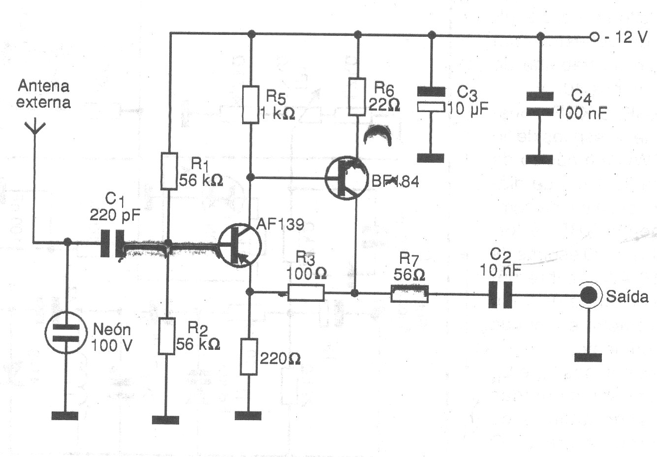This signal booster that ranges from long waves to about 30 MHz is recommended to be used with external antennas in places with difficult reception. The circuit can be powered by a small source of about 50 mA and the neon lamp serves as a protective element against static discharges.
